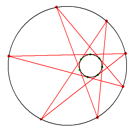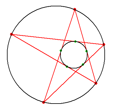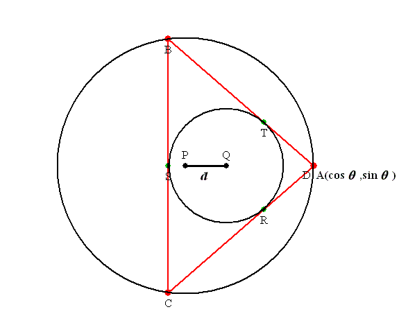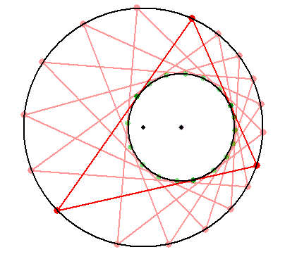『ポンスレーの閉形問題』(ポンスレーの定理) −−−2つの定円に内外接する三角形の問題−−− 2円P,Qがあり、それらの半径をR,rとするとき、 2円の中心間距離dが、 d^2=R^2−2Rr ならば、円Pに内接し円Qに外接する三角形は、無数に存在する。 |