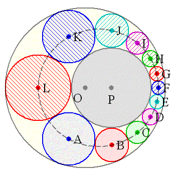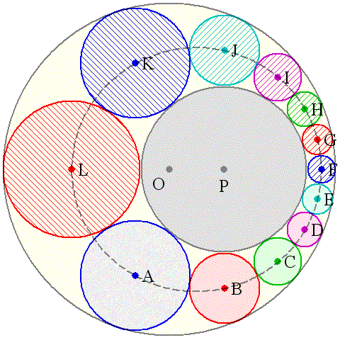 『シュタイナー・チェーン』(Steinerの定理1828年) −−−2つの定円に内外接するn 個の円環−−− 円O内に円Pがあり、これらに接しかつ外接する円を順次描いて、 初めの円に外接させることが一度できれば、どの位置からはじめても、 必ず元の円に外接することが出来る。 円Oの半径をR、円Pの半径をrとし、中心間距離をdとすると、 d^2=(R−r)^2−4Rr・tan(π/n) ここで、nは外接する円の個数である。 |