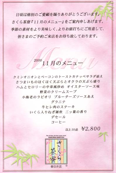 写真は、岩村城址の紅葉と、さくら茶寮の11月のメニュー。