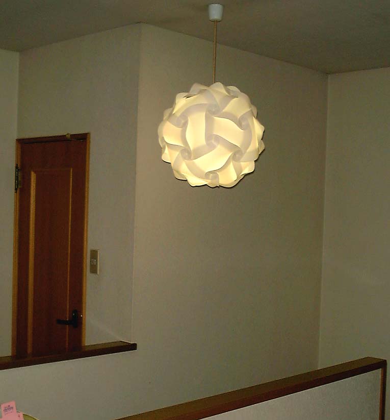 帰宅すると、注文してあった『IQ light』が届いていた。30枚のパネルを組み立てて、既存のライトにセットした写真(左側)。我が家の階段の上のところに設置。なかなか、存在感のある大きさで、GOOD!!。