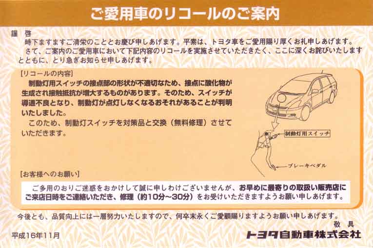 昨日届いた、プリウスのリコール連絡はがき(右)。発売前に発注しただけあって、初期不良が色々発見されるようである。
