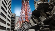 本来、地面に垂直に立っている電柱が斜めに写っています。