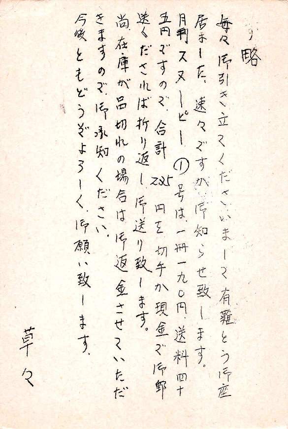 葉書は、月刊スヌーピー1号をバックナンバーで購入する為のやり取りした葉書。