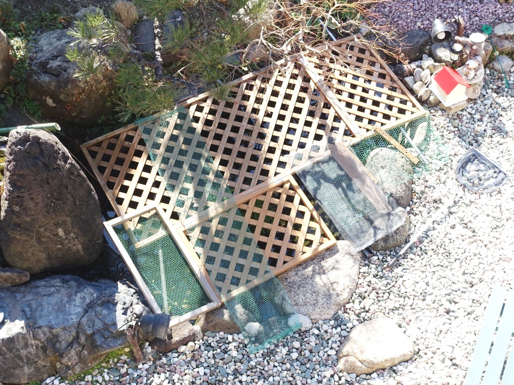 鯉も被害に遭って、何故か今年は越冬出来ない個体がたくさん。ということで、端から端までずずずいーっと、囲ってみました。
