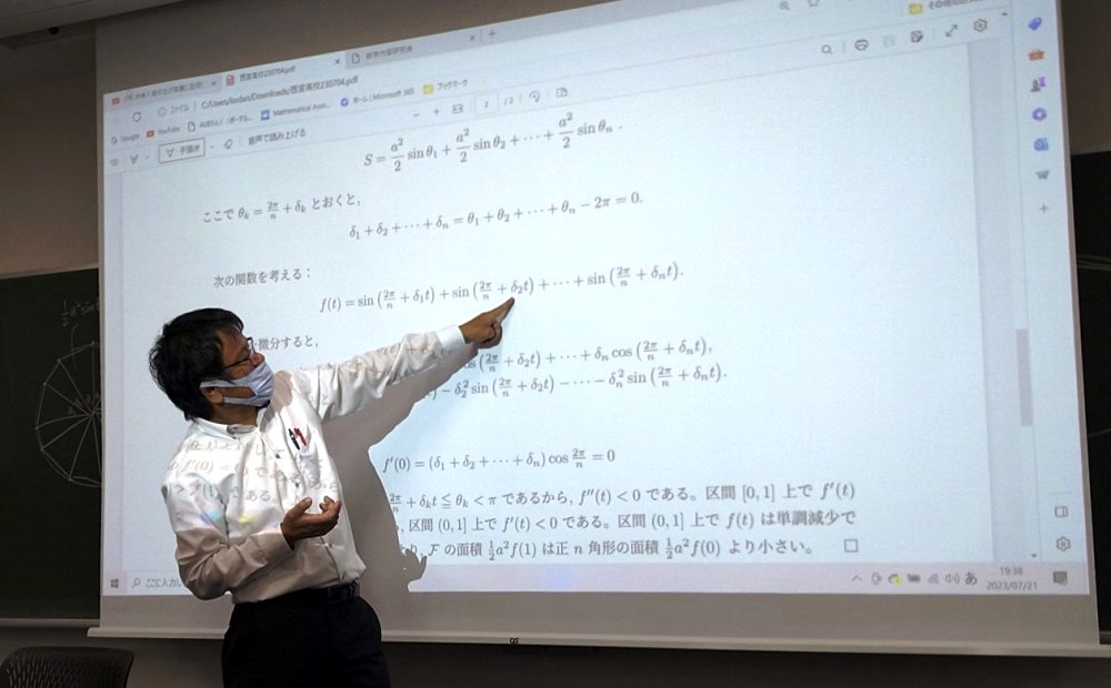 高校の数学3で学習する内容だけでエレガントに証明できることを考えられたという紹介。