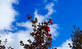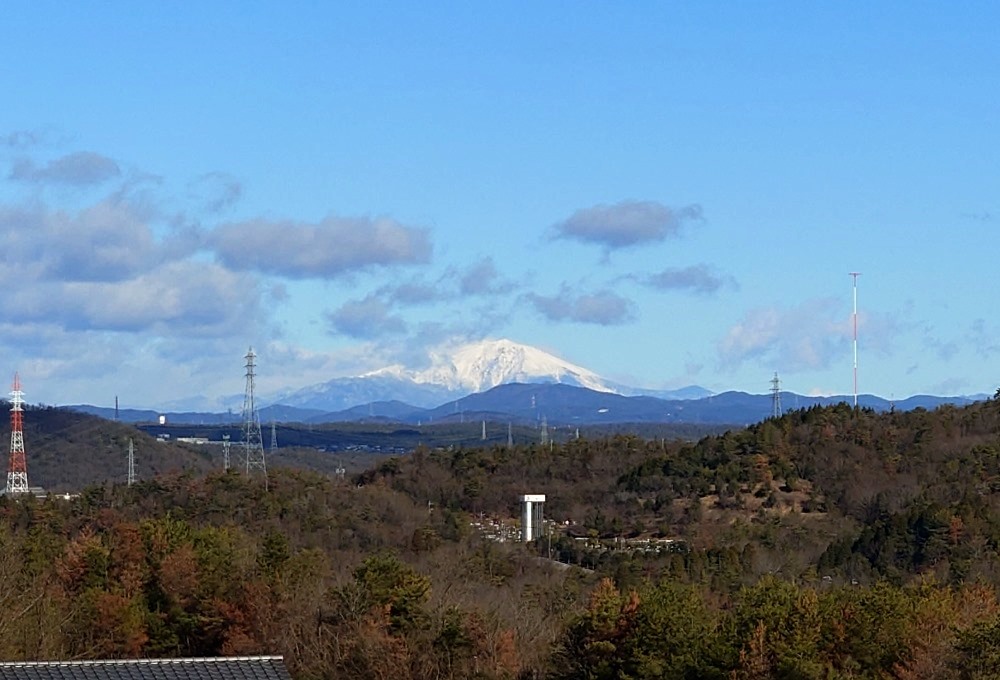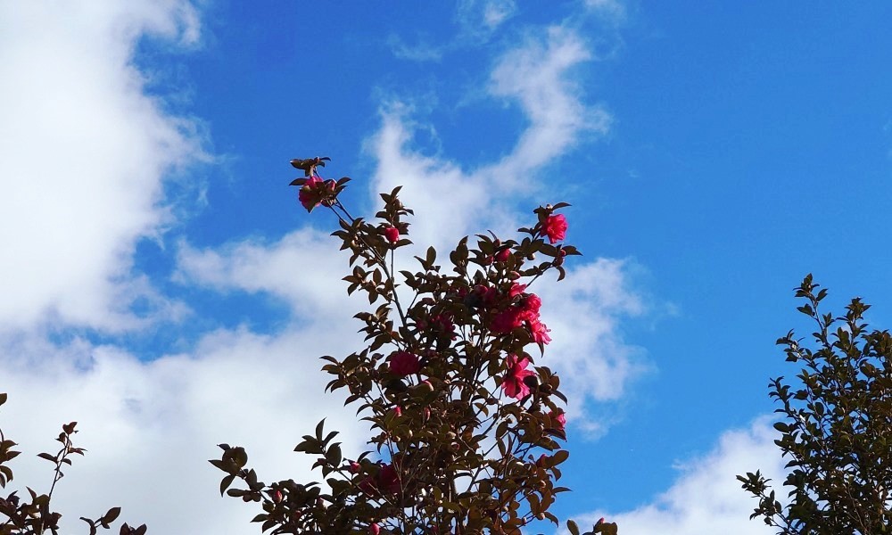 今シーズンの初雪と、午後の晴天とサザンカの花