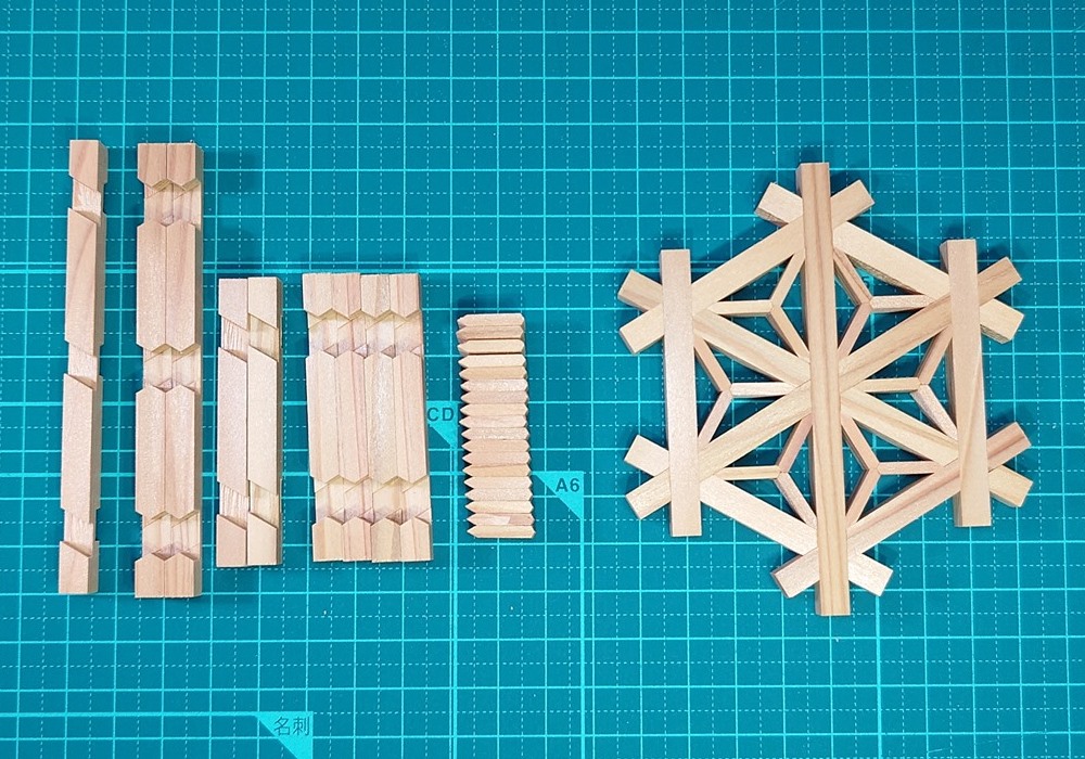 岡野建具工芸のキット(左)と完成したコースター(右)