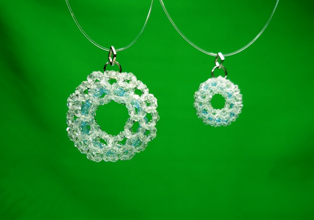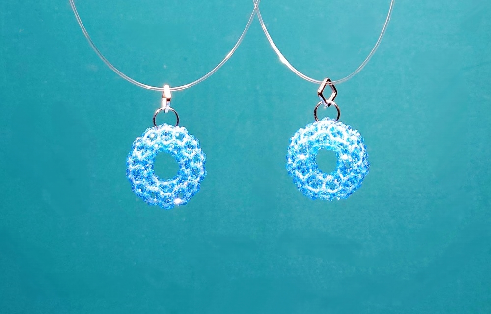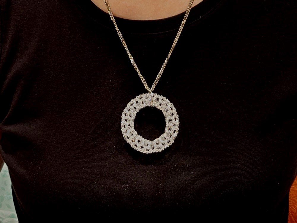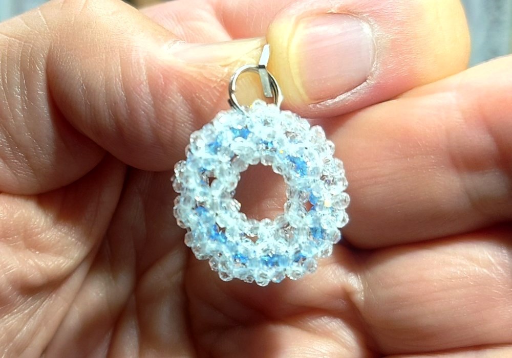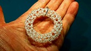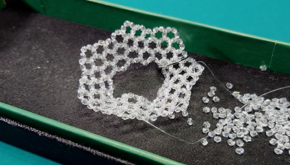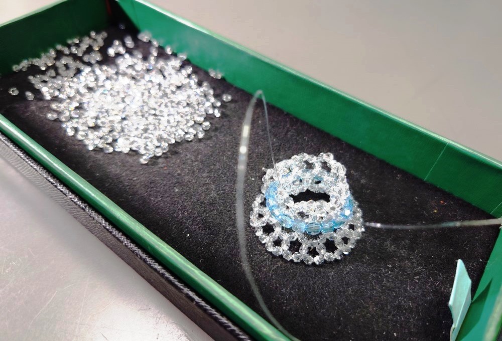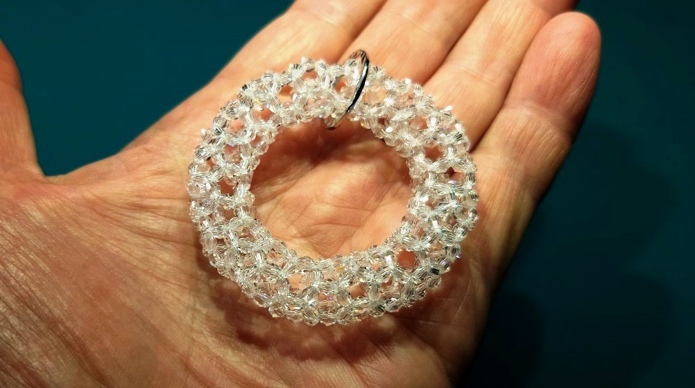 約30年前に考えた336個のリング、初めてスワロフスキーの3mmで編んだ。