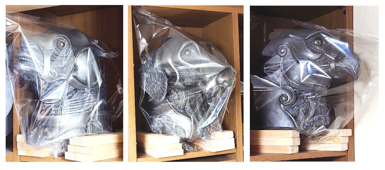 長い間、倉庫に置いていたが、その部屋を整理し棚に飾ってみた。埃除けの透明にシートで包んで・・・。