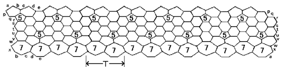 最後(14個目)の7角形が完成し、ドーナツの内側が完成したところ。 これで、ドーナツの最初の「輪構造」が確定する。 これ以後、7角形は出てこない。後は、6角形と14個の5角形である。 |