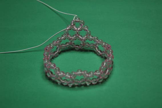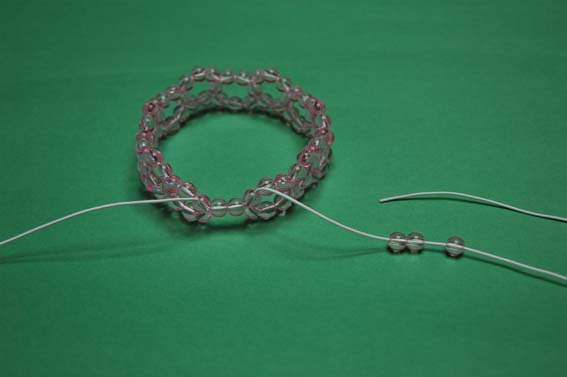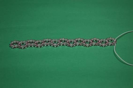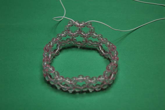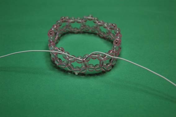 14個目の7角形は、最初の7角形と共有するビーズがあるので、 写真では3個の隣のゴムの方に2個を通し、最初の7角形の共有すべきビーズに通す。 | |