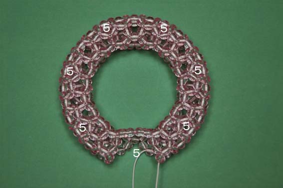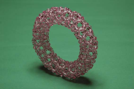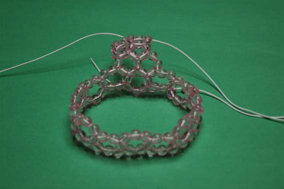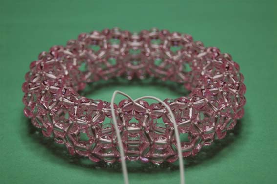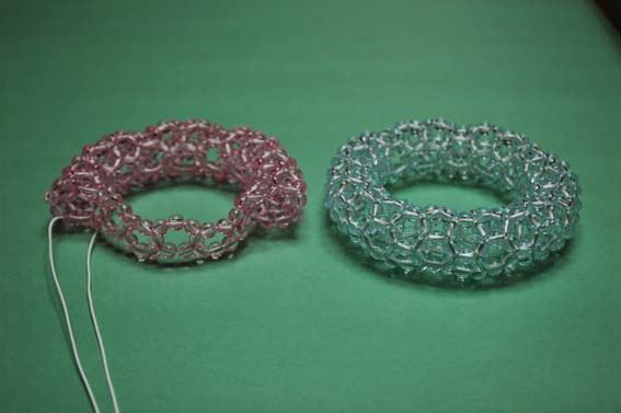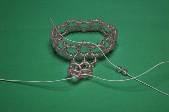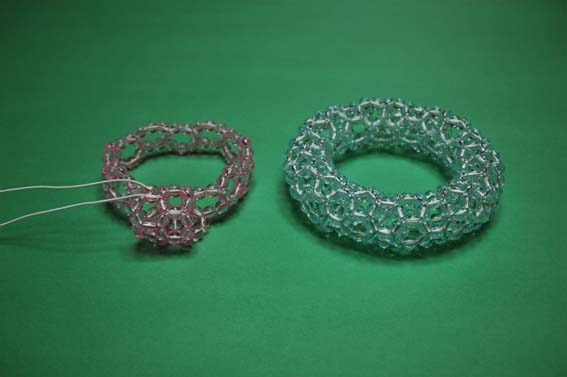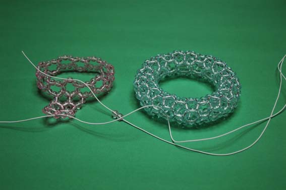 5角形の隣の6角形の向こうに、6角形を作るのだが、 7角形と1個のビーズを共有しすることにより、6角形を形成する。 これで、ドーナツのもう1つの「輪構造」が確定する。 |
