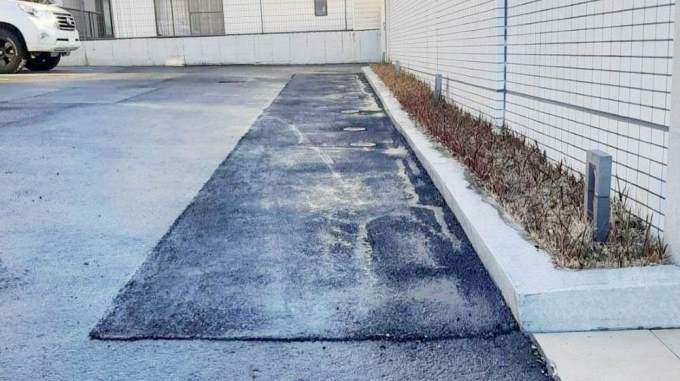 ![]() 駐車場のアスファルト路面のゆがみ(2022/6頃) ![]() 駐車場の一部アスファルト工事中(2023/01/31) ![]() 工事完了時・水による温度管理(2023/01/31) ![]() 約1週間後の様子(2023/02/08) |