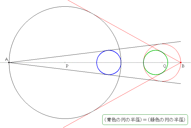 2点A,Bは2円P,Qの中心線上にあり、それぞれの円の直径の端点(☆)である。 いま、2点A,Bから、それぞれもう一方の円に2本ずつ接線を引く。 接線と円で囲まれた図形(※)に内接する2つの円の半径は常に等しい。 (☆)端点は、2つずつあるが、もっとも遠い2点をA,Bとする。 (※)扇形のようであるが、扇形ではないことに注意。 |